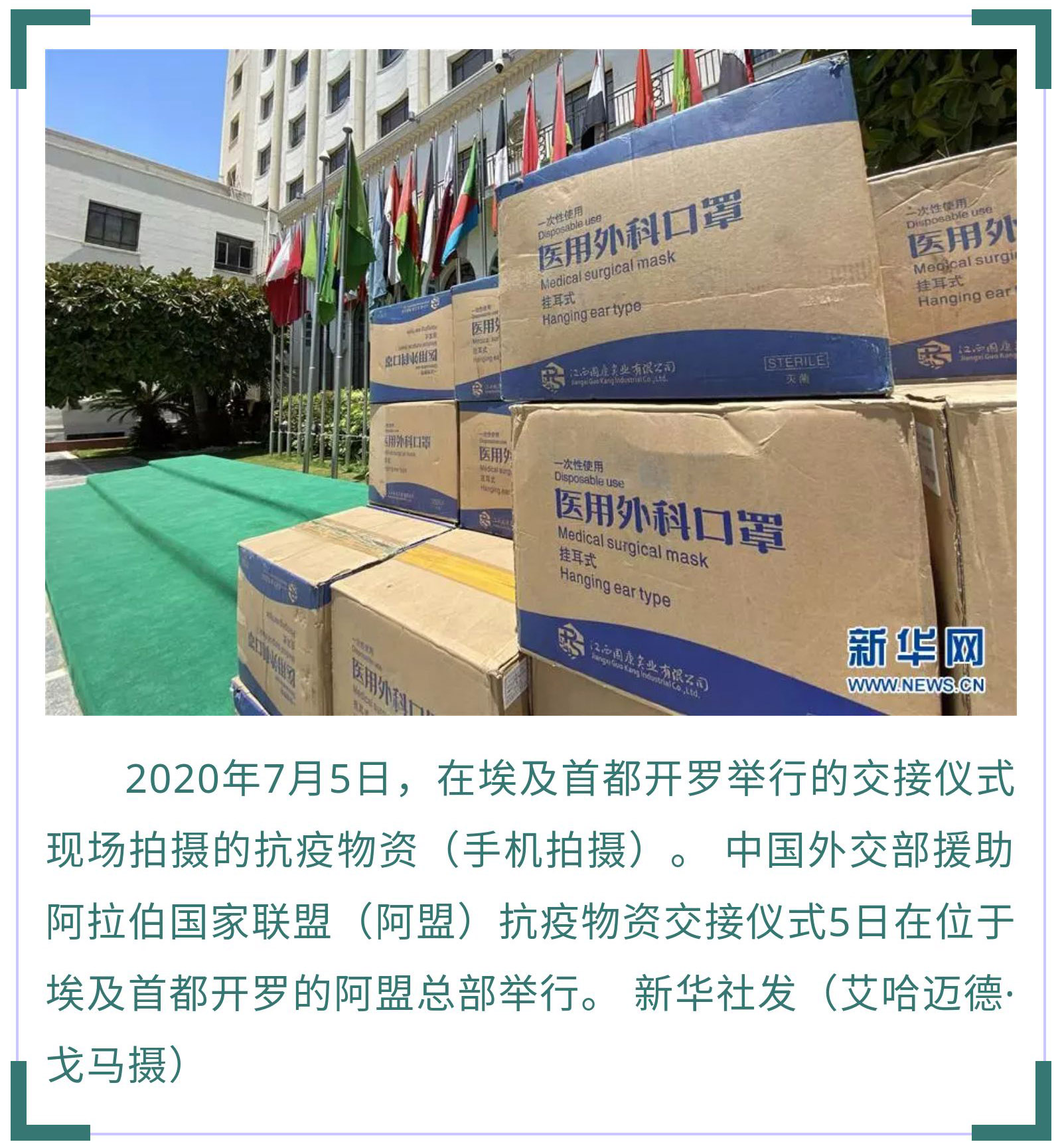 7月5日,中国外交部援助阿盟抗疫物资交接仪式在开罗举行。中国驻埃及大使廖力强代表中国外交部向阿盟副秘书长胡萨姆·扎基移交了防护口罩。据廖力强介绍,新冠疫情暴发以来,中方向阿拉伯国家援助了大量物资,毫无保留地向阿拉伯国家分享抗疫经验和技术,同21个阿拉伯国家举办了卫生专家视频会议,向8个阿拉伯国家派遣了医疗组,同时协助阿拉伯国家在中国采购抗疫物资,支持阿拉伯国家有序复工复产。