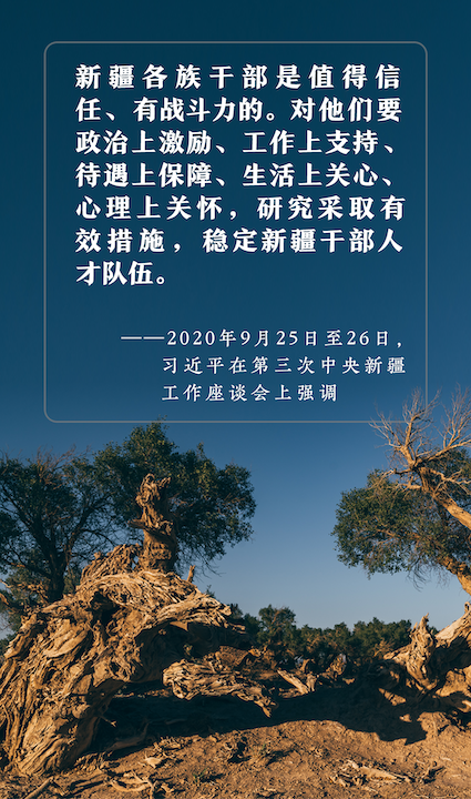 △2020年9月25日至26日,第三次中央新疆工作座谈会在北京召开。习近平出席会议并发表重要讲话。