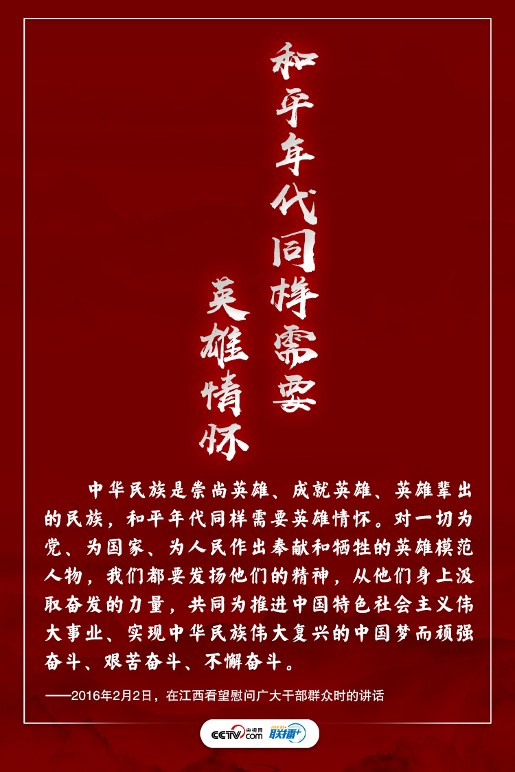 “天地英雄气,千秋尚凛然。”党的十八大以来,习近平总书记曾在多个场合表达对英雄的崇敬之情,号召全社会铭记英雄、崇尚英雄、捍卫英雄、学习英雄、关爱英雄,声声话语催人奋进。央视网《联播+》特梳理,以飨读者。