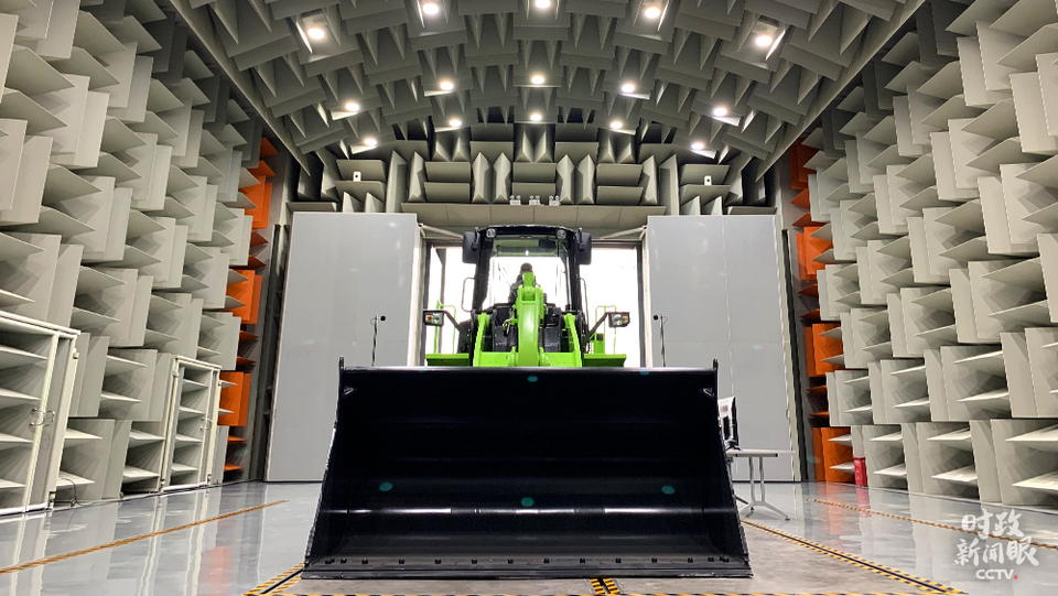 △研发中心的半消声实验室正在为一款纯电动装载机检测噪声数据。(总台央视记者程铖、张晓鹏拍摄)