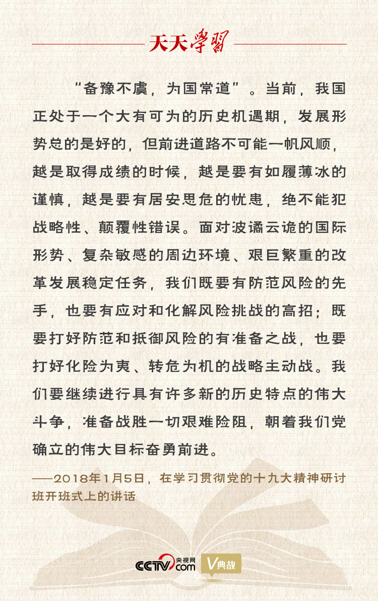 今天,我们比历史上任何时期都更接近、更有信心和能力实现中华民族伟大复兴的目标。但前进道路上,还有许多“雪山”“草地”需要跨越,还有许多“娄山关”“腊子口”需要征服。我们既要有防范风险的先手,也要有应对和化解风险挑战的高招;既要打好防范和抵御风险的有准备之战,也要打好化险为夷、转危为机的战略主动战。居安思危、锐意进取,努力续写百年大党不断走向胜利的时代新篇。