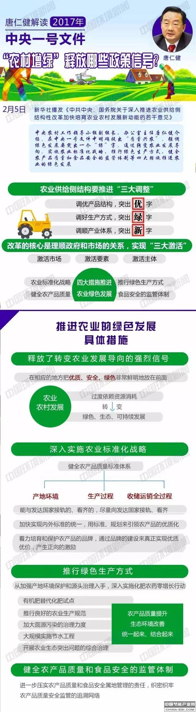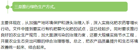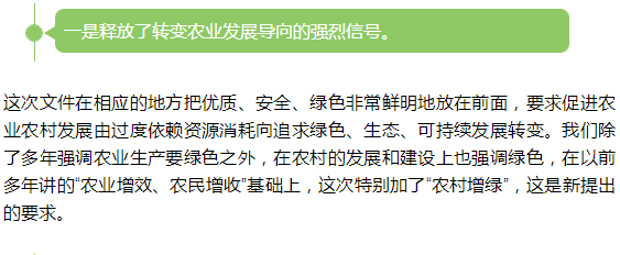 国新办6日举行新闻发布会,解读《中共中央国务院关于深入推进农业供给侧结构性改革加快培育农业农村发展新动能的若干意见》有关情况,中央农村工作领导小组副组长、办公室主任唐仁健介绍,在中央一号文件中明确提出“质量兴农”,强调绿色发展要突出一个“绿”字,通过转变农业发展导向,实施农业标准化战略、推行绿色生产方式、健全农产品质量和食品安全的监管体制等四大措施推进农业的绿色发展。