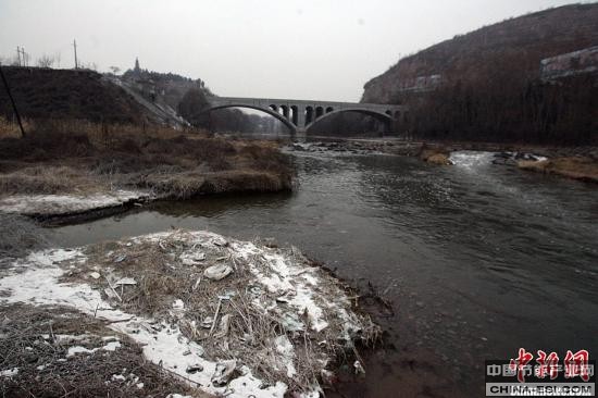 资料图:2013年,山西天脊煤化工集团股份有限公司8.7吨苯胺发生泄漏事故,河北、河南两省也受到影响,三省联动应急,截流治污。图为排污渠与浊漳河交汇口河边随处可见除污所用的石灰。张云 摄