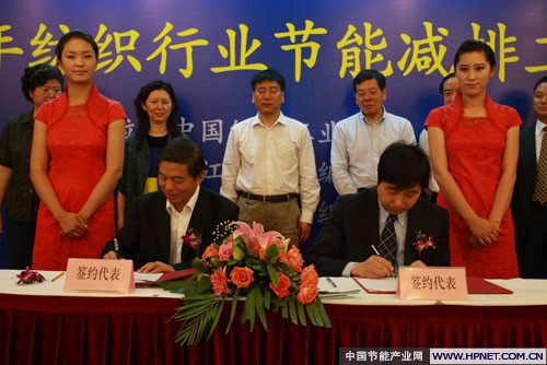 节能减排工作开展后,协会选定了海宁经编产业园区、太原新凯纺织印染有限公司作为第一批试点示范企业。并进行了协会与示范企业的签约仪式,杨东辉副会长与企业代表进行了节能减排示范企业签约。