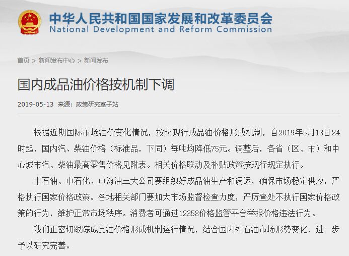 国家发改委刚刚发布通知, 根据近期国际市场油价变化情况,按照现行成品油价格形成机制,自2019年5月13日24时起,国内汽、柴油价格(标准品,下同)每吨均降低75元。