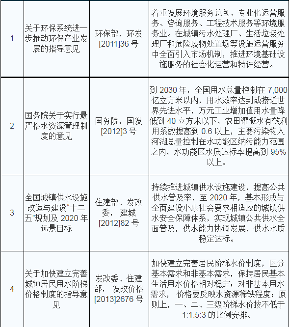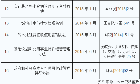 国家有关部门制定了一系列水务行业的法律、法规和政策等规范性文件,涉及运营资质、运行质量、项目建设标准、价格管理、供排水标准等诸多方面。水务行业相关的主要法律法规、政策如下:
