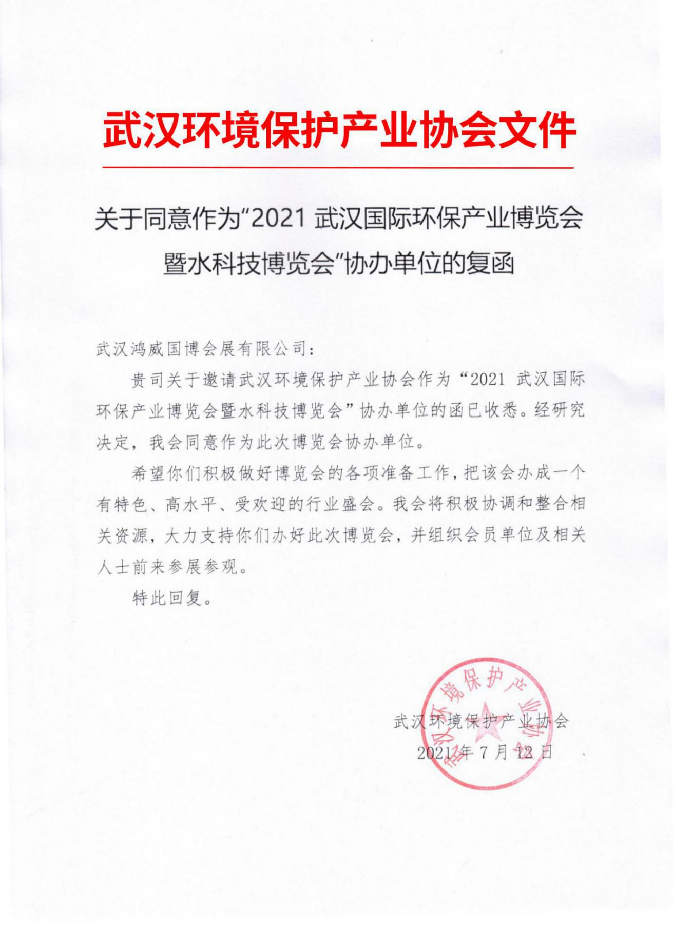 贵司关于邀请武汉环保保护产业协会作为“2021武汉国际环保产业博览会暨水科技博览会”协办单位的函已收悉。经研究决定,我会同意作为此次博览会协办单位。