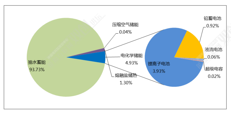 中国已投运储能项目累计装机规模为32.3GW。其中抽水蓄能累计装机规模最大,为30.3GW;以电化学储能和物理储能为主的电力储能技术累计装机规模位列第二,为1592.3MW。
