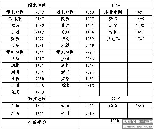 2012年度各省级电网区域风电利用小时数统计表