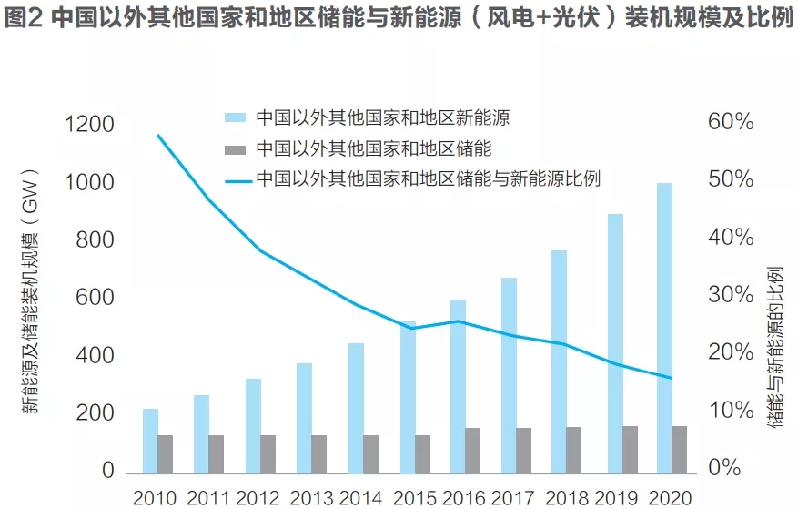 储能与新能源装机规模的比例(简称“储新比”)在2015年之前快速下降,在该阶段储能(抽水蓄能)主要服务于传统能源发电的调频调峰服务,与新能源发电的关联性不大。2015年之后储新比数值下降幅度趋缓,国际和国内市场呈现了相同的趋势(图1~图3)。虽然最近几年储能产业的发展得到各国重视,保持了良好的发展态势,但同时,风电和光伏发电也在近几年得到快速发展,因此总体而言,储能产业的发展步伐仍然落后于新能源产业的发展,储新比呈现下降趋势。