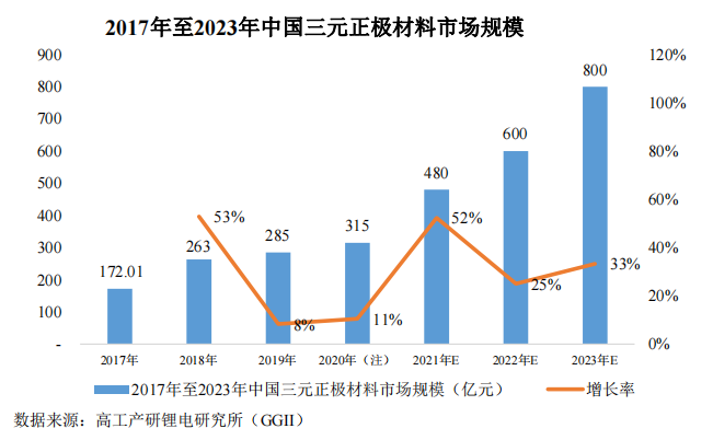 根据高工产研锂电研究所(GGII)调研数据,2018-2020年,我国三元正极材料市场规模从263亿元增长至315亿元,到2023年三元正极材料市场规模预计达到800亿元。