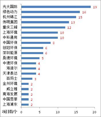国内从事垃圾焚烧发电的投资商约有40~50家,按类型可分为政府主导型、专业投资运营型和工程投资型三类。图为21家主要企业截至2012年10月的垃圾焚烧项目数据。