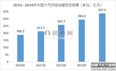 以大气污染治理为例,据前瞻产业研究院发布的《中国环保行业发展前景与投资预测分析报告》数据显示,我国对大气污染治理的投资金额不断增长,已从2010年的188.2亿元增至2014年的337.5亿元。