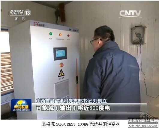 此次《新闻联播》聚焦的山西吉县是国家级贫困县,也是国家首批光伏扶贫试点县之一,吉县屯里镇窑渠村更是远近闻名的贫困村,交通不方便,又没有可以开发的资源。吉县建设了多座100千瓦扶贫光伏村级电站、每年可为每个村创收超过十万元、其中用于专项扶贫资金超过6万元,切实有效地帮助贫困地区脱贫致富。晶福源的100KW并网逆变器稳定而高效地把电能输送至电网。