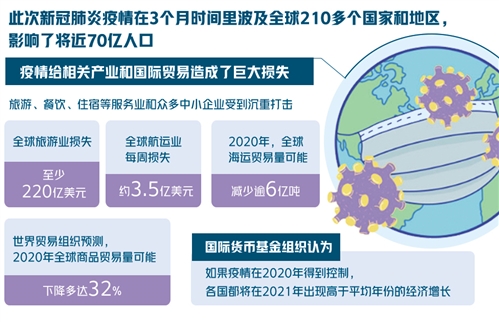 疫情给相关产业和国际贸易造成巨大损失。旅游、餐饮、住宿等服务业和众多中小企业受到沉重打击。全球旅游业损失至少220亿美元。全球航运业每周损失约3.5亿美元。2020年,全球海运贸易量可能减少逾6亿吨,为35年来最大降幅。世界贸易组织预测,今年全球商品贸易量可能下降多达32%。