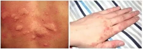 急性期:皮肤会发痒,出现红斑、丘疹、水疱,严重的话,皮肤上的疙瘩还会渗出脓水;