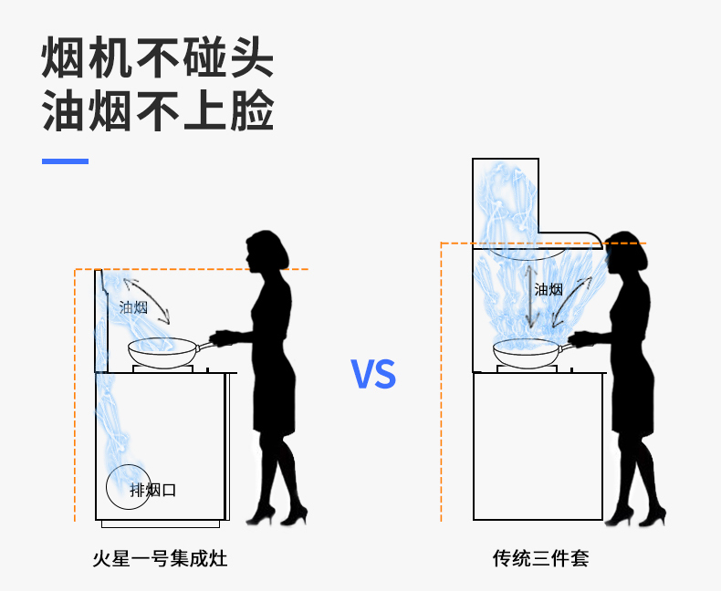 火星一号集成灶运用微空气动力学原理,把污染源和外环境进行双向隔离。在不影响视线的前提下,将油烟在经过面部口鼻之前就马上吸走,在油烟还未向四周扩散前进行扫除,使厨房环境干净整洁,不染油烟。