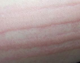 皮肤划痕症荨麻疹的我们称之为延迟性皮肤划痕症,就是在皮肤划痕后6到8小时才出现红斑风团,风团持续时间也是比较长的,长达24到48小时,有自觉局部发热甚至是压痛的一些特点。