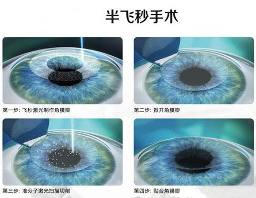 半飞秒:第一步用飞秒激光做一个角膜瓣,然后用准分子激光以“消融”的方式进行角膜基质切削,再把角膜瓣复位,手术很快就结束了。