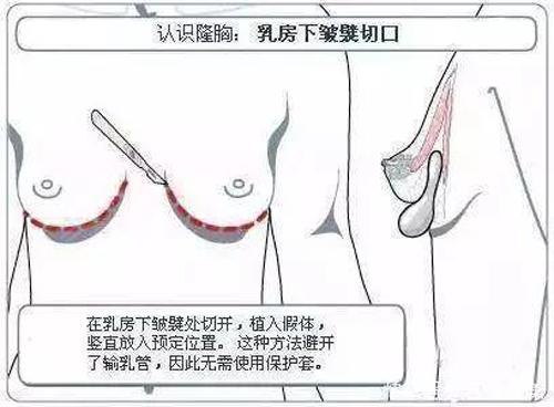 在乳房下皱襞切开,置入假体,放入预定位置。乳房下皱襞切口长度一般为3-6cm,切口多位于乳房下皱襞中央或者偏外。由于乳房下皱襞没有乳腺组织,不会损伤乳腺,这种方法很好的避开了输乳管,沿该切口下去,医生会直接剥离到胸大肌后间隙,仔细止血后将假体置入。