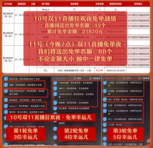 2019年双11,张晓飞豪横拍板抽免单,连续3场直播,超过10个小时的直播时长,累计送出111个免单,单个学员免单金额高达9800元。