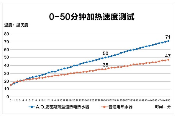 从温度与时间的折线图可以看到,第50分钟时,史密斯薄型速热电热水器的水温已经上升至71℃,而普通电热水器仅仅加热到47℃。