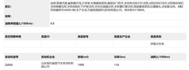 最主要的不同在于搭载了,一台代号为G4NA的2.0升自然吸气发动机,最大功率依旧为160马力,但支持国六排放标准,与之搭配的应该也依旧是6速手动和6AT变速箱,同时可能是有了技术上的进步,百公里申报油耗降低到6.8升。