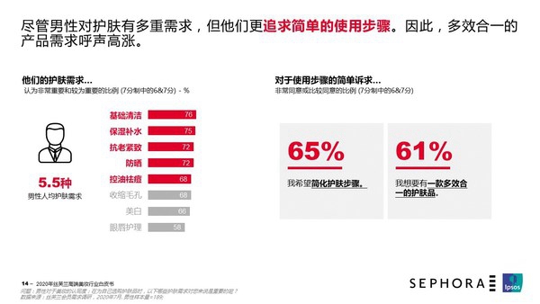 72%的丝芙兰男性会员认为外表对他们至关重要,近三成每天花30分钟以上的时间进行日常护肤。男性美妆市场主要受护肤类产品主导,98%的男性消费者会购买护肤产品。65%的男性希望简化护肤步骤,多效合一的护肤品呼声高涨(61%)。