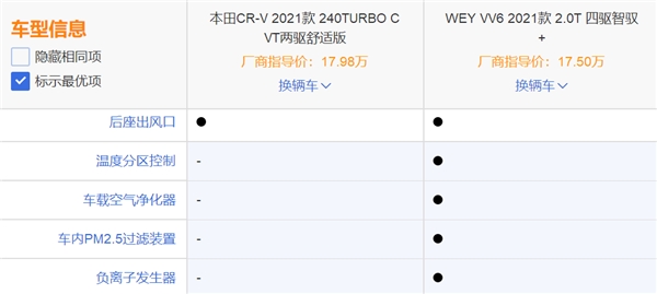 可在百花齐放的市场中,家庭用车着实不少,如何才能准确地找到符合自己需求的座驾呢?在经过对市场的深入调研后,我终于将目光锁定在了两款家用市场明星车型身上,它们分别是:本田CR-V(2021款 240TURBO CVT两驱舒适版,厂商指导价:17.98万元)、WEY VV6(2021款 2.0T 四驱智驭+,厂商指导价:17.50万元),但想要知道谁才是首选车型,那还得通过一番对比得出答案。