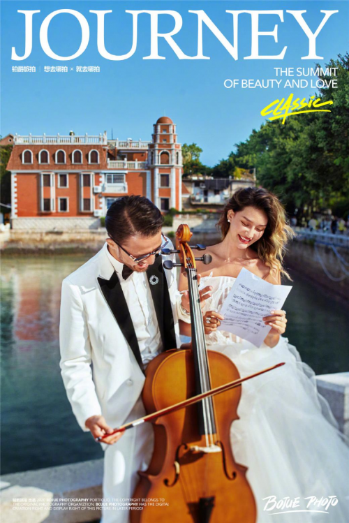 在本组烂漫风婚纱照中,铂爵造型师根据环境特点和新娘的身材特点,为新娘搭配了一套白色露肩婚纱。在蔚蓝的天空下,二人吹着温柔的风,一人拉琴,一人拿谱,是那么的悠闲自得,不用刻意的安排,一切都刚刚好。