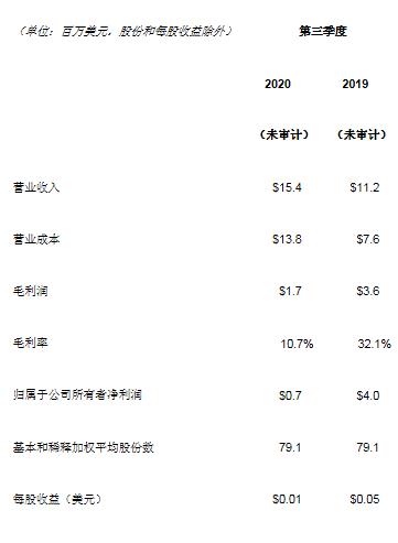 2020年第三季度,归属于公司所有者净利润为70万美元,基本每股收益和稀释每股收益均为0.01美元,2019年同期归属于公司所有者净利润为400万美元,基本每股收益和稀释每股收益均为0.05美元。