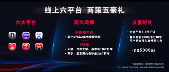 线下政策丰富,线上政策同样贴心。用户通过奔腾官网、汽车之家、易车、苏宁、京东、天猫等六大平台下单,不止有机会抽到7折车的权益,更有望将出行生态畅享礼包带回家。此外,在北京卫视《苏宁易购1111超级秀》上,奔腾还将抽出5台B70的 2年免费使用权。如此给力的预售政策,堪称今年“双十一”的硬核玩家。