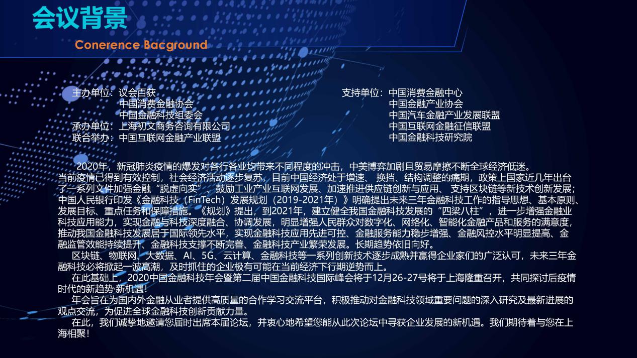 在此基础上,2020中国金融科技年会暨第二届中国金融科技国际峰会将于12月26-27号将于上海隆重召开,共同探讨后疫情时代的新趋势·新机遇!