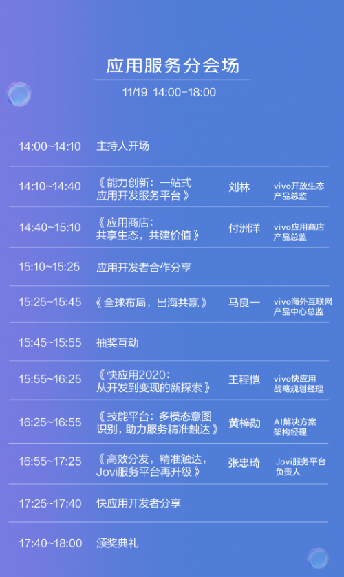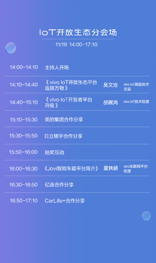 在技术开发分会场、loT开放生态分会场、应用服务分会场,vivo将借助VCAP计算加速平台和Multiturbo平台,通过与手机系统深度整合,实现跨品牌设备的互动体验和组建智能生活场景,为开发者和用户创建智能化的服务体验。想要了解loT车联网、技能平台开放的开发者,可以着重关注一下loT开放生态分会场、应用服务分会场的相关内容。