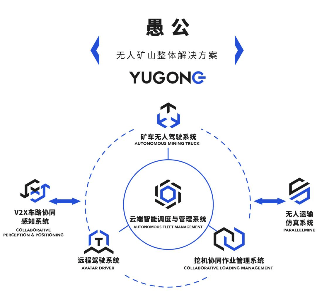 2020年5月,慧拓发布了“愚公YUGONG”无人矿山整体解决方案,其核心就是虚拟矿山与现实矿山实时互动、协同工作、平行演进的平行矿山操作系统,通过一体化指挥与调度经过改装的智能化单车作业系统、多车协同系统和车路协同系统,完成多种场景下的各类诸如智慧运输调度、智能无人驾驶、远程接管任务,进而迁移到不同矿区不同作业场景,推动矿区智能化无人化发展。该系统可大幅度降低人工成本,提高生产作业效率,并可结合社会发展要素为实现绿色可持续发展矿区提供技术支撑。