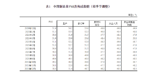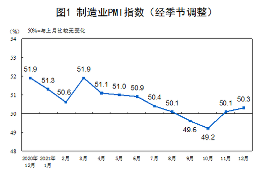 12月份,中国制造业采购经理指数(PMI)为50.3%,比上月上升0.2个百分点,高于临界点,制造业景气水平继续回升。