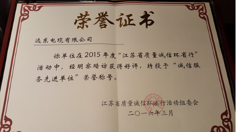 3月15日,2015年度“江苏质量诚信环省行”活动总结表彰大会在南京举行。远东智慧能源股份有限公司(简称:远东智慧能源 股票代码:600869)全资子公司远东电缆有限公司在2015年度“江苏省质量诚信环省行”活动中,经明察暗访获得好评,被授予“江苏省诚信服务先进单位”荣誉称号,成为江苏线缆行业唯一一家获得该荣誉的企业。远东智慧能源投资人、市场总监助理兼远东电缆市场总监慎叶昌代表公司参会并领奖。