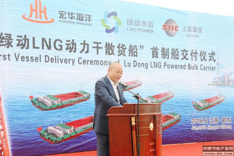 2016年6月16日上午,江苏启东宏华海洋油气装备(江苏)有限公司造船现场,在全球第一大造船吊机的背景下,绿动水上运输有限公司在宏华海洋油气装备(江苏)有限公司订造的大批量纯LNG动力内河干散货船的首制船交付仪式在盛大举行。