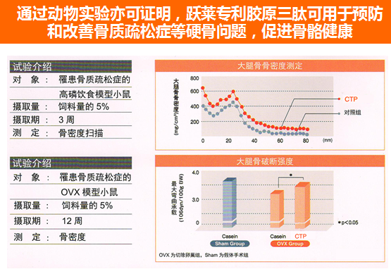 目前市面上的胶原蛋白产品主要有3种,第一代胶原蛋白分子量在3000-5000D,第二代胶原蛋白肽(前面提到健骨产品的主要配料)分子量在1000-3000D,跃莱专利的第三代胶原三肽分子量在280D,而只有三肽形式的胶原蛋白,才能被小肠直接吸收。并且胶原三肽不是像氨基酸那样依靠小肠内不同氨基酸的浓度差进行吸收的,而是小肠内有一个多肽物质的吸收通道,是直接被吸收利用的!吸收后的胶原三肽会直接作用于骨骼,CTP可提高耐力作用,促进钙的吸收,有显著增强老龄骨强度,增强骨骼中羟脯氨酸和骨钙含量,以及增强细胞免疫的作用等多种功效,立体维护骨骼健康。