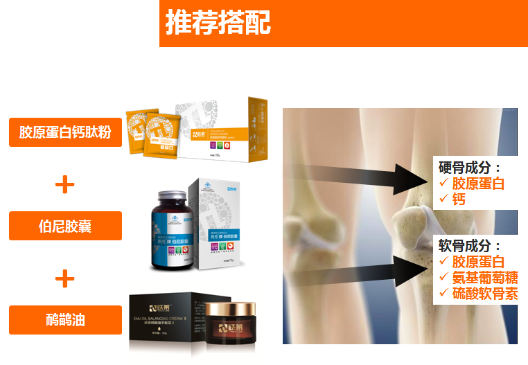 前面提到的健骨产品配方主要成分仅含水解胶原蛋白粉(分子量3000D)、麦芽糊精、果糖和果蔬粉,只提供了大分子的水解胶原蛋白,不含易吸收的小分子肽,另外产品未提供硬骨所需的“钙”,也未提供软骨所需的“硫酸软骨素”与“氨基葡萄糖盐酸盐”,不能给骨骼提供全面的养护,远不能满足骨骼所需营养。根据骨骼成分,有针对性的补充营养软硬兼施,内调外养,才是立体养护骨骼健康正确法则!