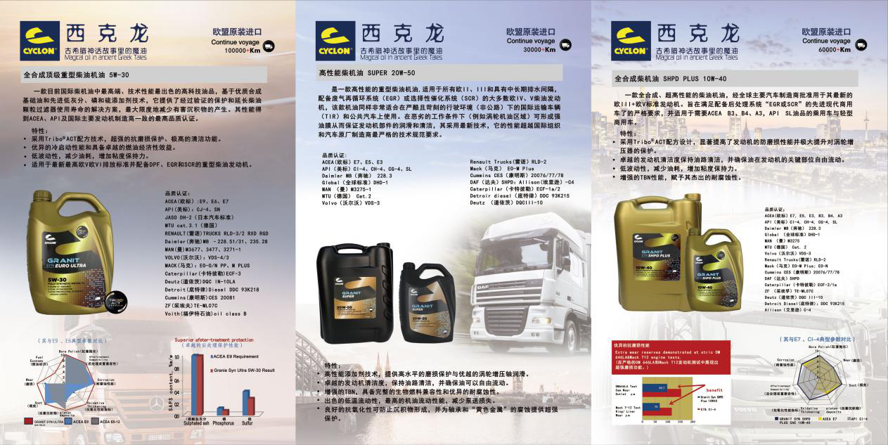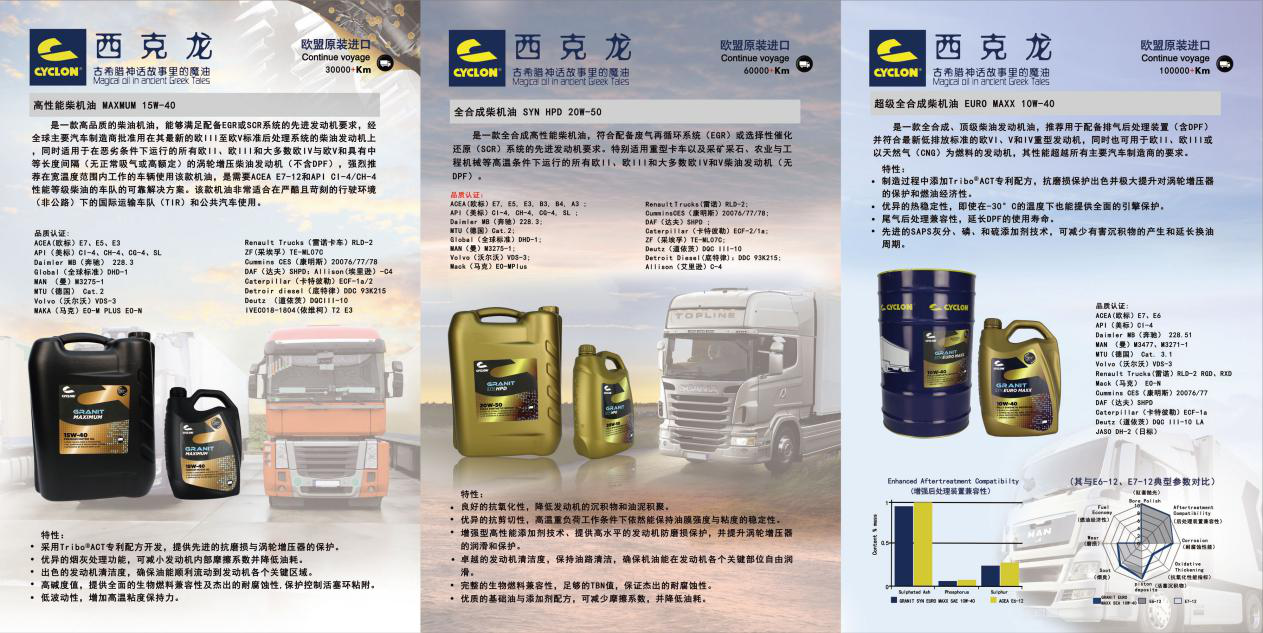 其西克龙润滑油系列之卡车油品各种型号的换油周期从30000+公里到60000+公里,再到100000+公里一应俱全,可满足广大卡友的个性化选择。