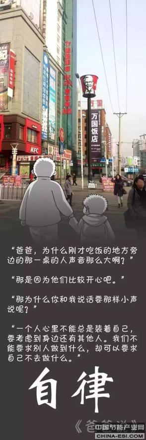 “爸爸,为什么刚才吃饭的地方旁边的那一桌的人声音那么大啊?” “那是因为他们比较开心吧。” “那为什么你和我说话要那样小声说呢?” “一个人心里不能总是装着自己,要考虑到身边还有其他人。我们不能要求别人做到什么,却可以要求 自己不去做什么。”——自律。