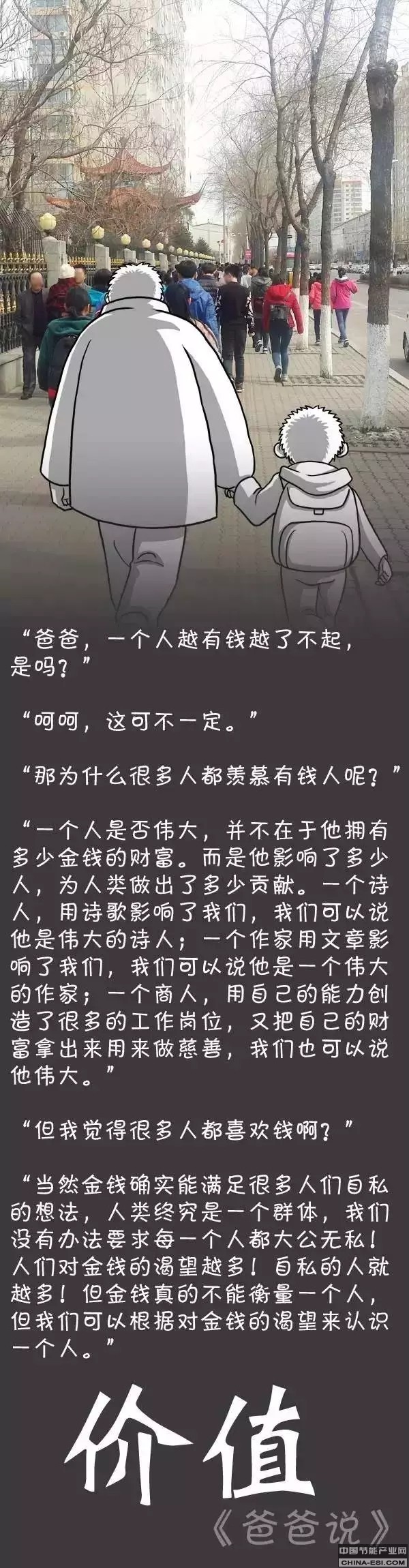 “爸爸,一个人越有钱越了不起,是吗?” “呵呵,这可不一定。” “那为什么很多人都羡慕有钱人呢?” “一个人是否伟大,并不在于他拥有多少金钱的财富。而是他影响了多少人,为人类做出了多少贡献。一个诗人,用诗歌影响了我们,我们可以说他是伟大的诗人;一个作家用文章影响了我们,我们可以说他是一个伟大的作家;一个商人,用自己的能力创造了很多工作岗位,又把自己的财富拿出来用来做慈善,我们也可以说他伟大。” “但我觉得很多人都喜欢钱啊?” “当然金钱确实能满足很多人自私的想法,人类终究是一个群体,我们没有办法要求每一个人都大公无私!人们对金钱的渴望越多!自私的人就越多!但金钱真的不能衡量一个人,但我们可以根据对金钱的渴望来认识一个人。” ——价值