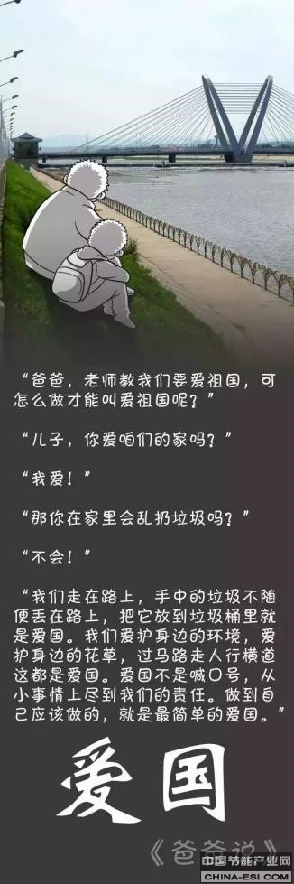 “爸爸,老师教我们要爱祖国,可怎么做才能叫爱祖国呢?” “儿子,你爱咱们的家吗?” “我爱!” “那你在家里会乱扔垃圾吗?” “不会!” “我们走在路上,手中的垃圾不随便丢在路上,把它放到垃圾桶里就是爱国。我们爱护身边的环境,爱护身边的花草,过马路走人行横道这都是爱国。爱国不是喊口号,从小事情上尽到我们的责任。做到自己应该做的,这就是最简单的爱国。”——爱国