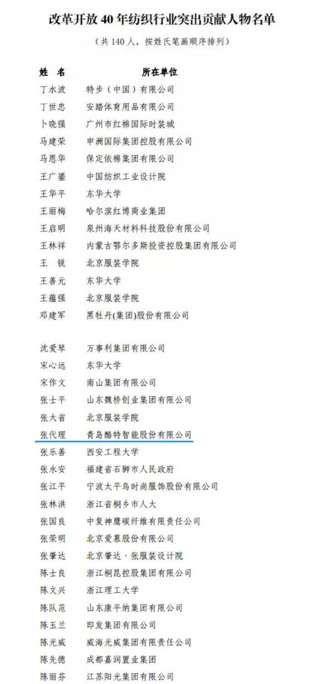 大会宣布授予张代理等同志“改革开放40年纺织行业突出贡献人物”称号(部分名单如下)