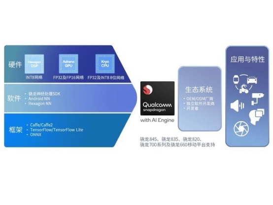 从AI的实现方式来看,麒麟980与骁龙845对于AI计算方式并不相同,麒麟980采用了第三方授权的独立AI计算单元NPU形式,骁龙845通过多年自主研发的技术沉淀,选择用异构计算和异构调度的方式实现AI功能,通过AI Engine对骁龙手机形成AI加持,以手机中的GPU、DSP和CPU多方协作的方式完成AI计算,如此做法可以在不增加硬件成本的前提下,胜任现阶段的各种AI应用,还可以把功耗降到最低。