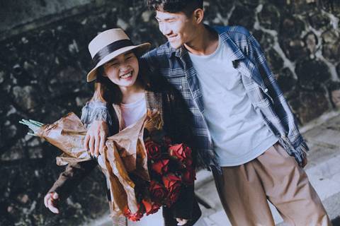 3.奔跑动作选择长头纱能动感十足,为了显瘦俩人可以多一些靠拢拥抱和前后站立的动作。经常在镜子前练习摆姿势,有备而拍。