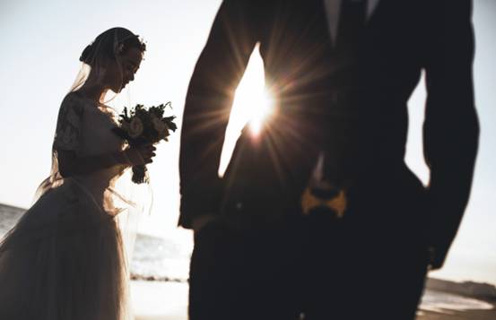 3、若即若离式:夫妻保持一定的距离,完全用眼神进行联系沟通。中间的情丝宛若可见,产生距离的美感。当然也含有千里因缘一线牵的韵味。