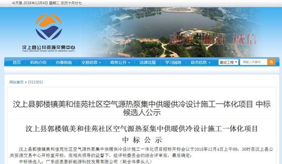 2018年12月4日上午09:30,“山东汶上县郭楼镇美和佳苑社区空气源热泵集中供暖供冷设计施工一体化”项目招标开标会议在汶上县公共资源交易中心开标室开标。在相关领导的监督下,经评标委员会综合评审后,最后确定广东纽恩泰新能源科技发展有限公司(以下简称“纽恩泰”)成功中标,为小区214284平方米的建筑(包括住宅楼82栋)提供空气能采暖和制冷服务。