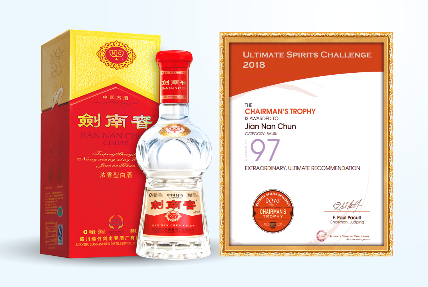 剑南春在2018年“终极烈酒挑战赛”上以97分高分(满分100分)力压茅台获得最高奖“主席奖杯”。比赛中,剑南春获得烈酒比赛第一名,茅台以96分获得第二名,如此重量级殊荣引得全球业内外媒体广泛关注。